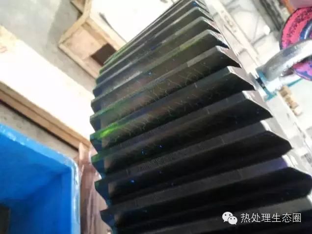 井式炉和箱式炉,两种不同的热处理设备、不同的热处理方式,但出现裂纹的情况一样。检验失效齿轮齿顶硬度:井式炉处理的齿轮为59.5HRC、60.0HRC、60.5HRC;箱式炉处理的齿轮为59.2HRC、59.8HRC。技术要求为59~62HRC,实测齿轮硬度满足技术要求。